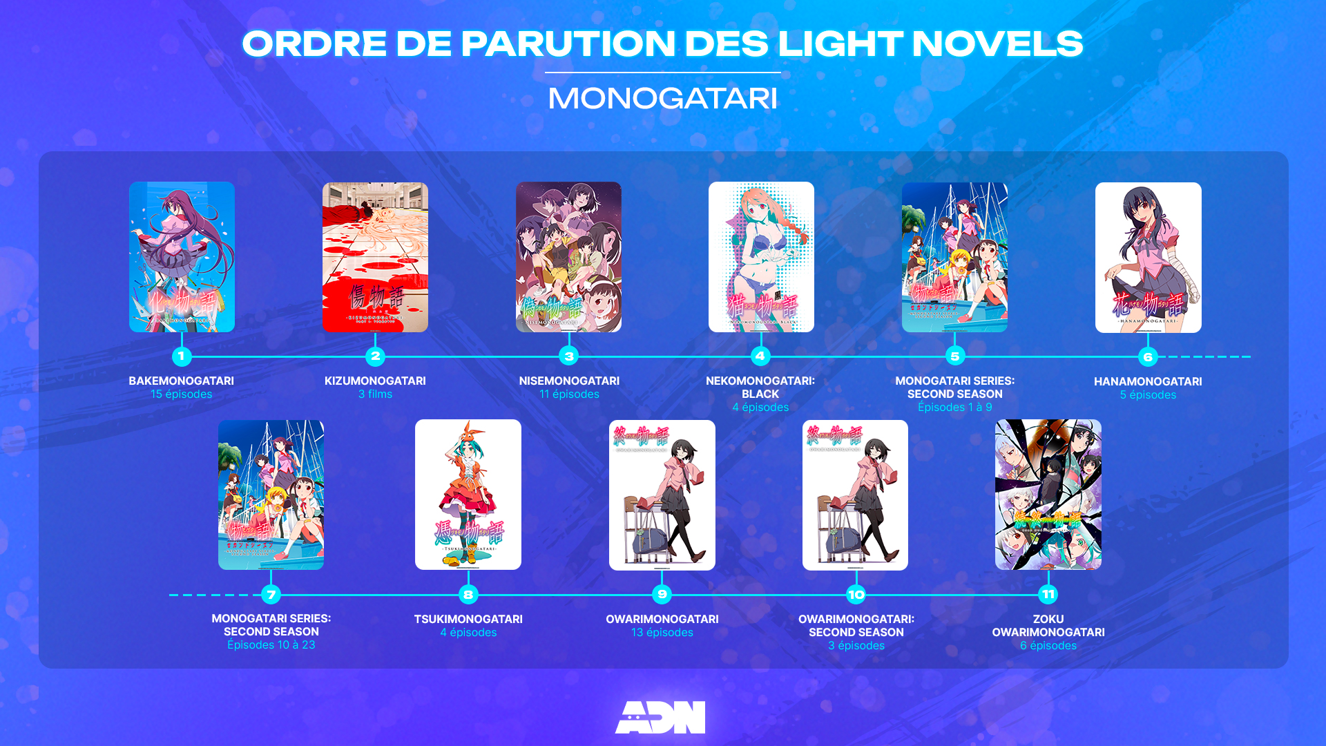 Si vous découvrez Monogatari pour la première fois, on vous recommande de suivre l’ordre des light novels. Cet ordre de visionnage permet de préserver au maximum le suspense et l’impact des révélations.